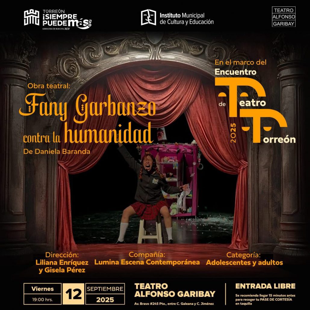 El 12 de septiembre, también a las 19:00 horas, se presentará Fany Garbanzo contra la humanidad, de Lumina Escena Contemporánea, una obra dirigida a las adolescencias que refleja el abandono emocional, el bullying y la violencia normalizada. A través de la fantasía y la amistad plantea la posibilidad de resistir con ternura en un mundo que castiga la diferencia.