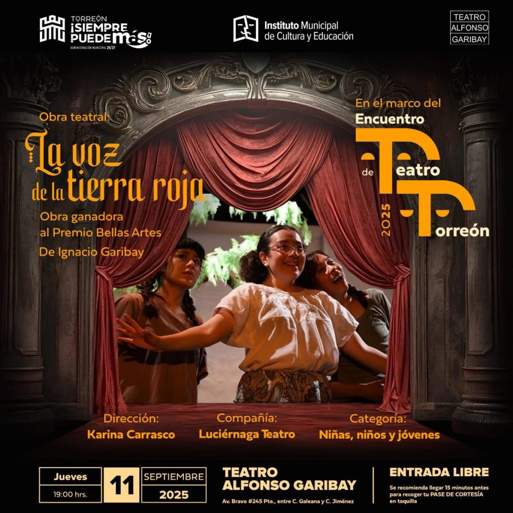 La primera presentación será “La Voz de la Tierra Roja”, de Luciérnaga Teatro, una comedia lúdica que narra la historia de Patricia, una niña huérfana que junto a su hermana, desafía las imposiciones sociales para construir un futuro distinto, inspirada por la voz de su madre.
