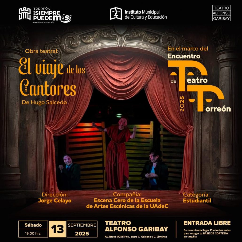 La programación continúa el 13 de septiembre a las 19:00 horas con “El viaje de los cantores”, de Escena Cero de la Escuela de Artes Escénicas UAdeC. Basada en hechos reales, revive la tragedia de migrantes que murieron asfixiados en su intento por cruzar la frontera. Esta propuesta entrelaza textos de Víctor Hugo Rascón Banda y se convierte en un rito escénico que confronta al espectador con la violencia estructural y la memoria colectiva.