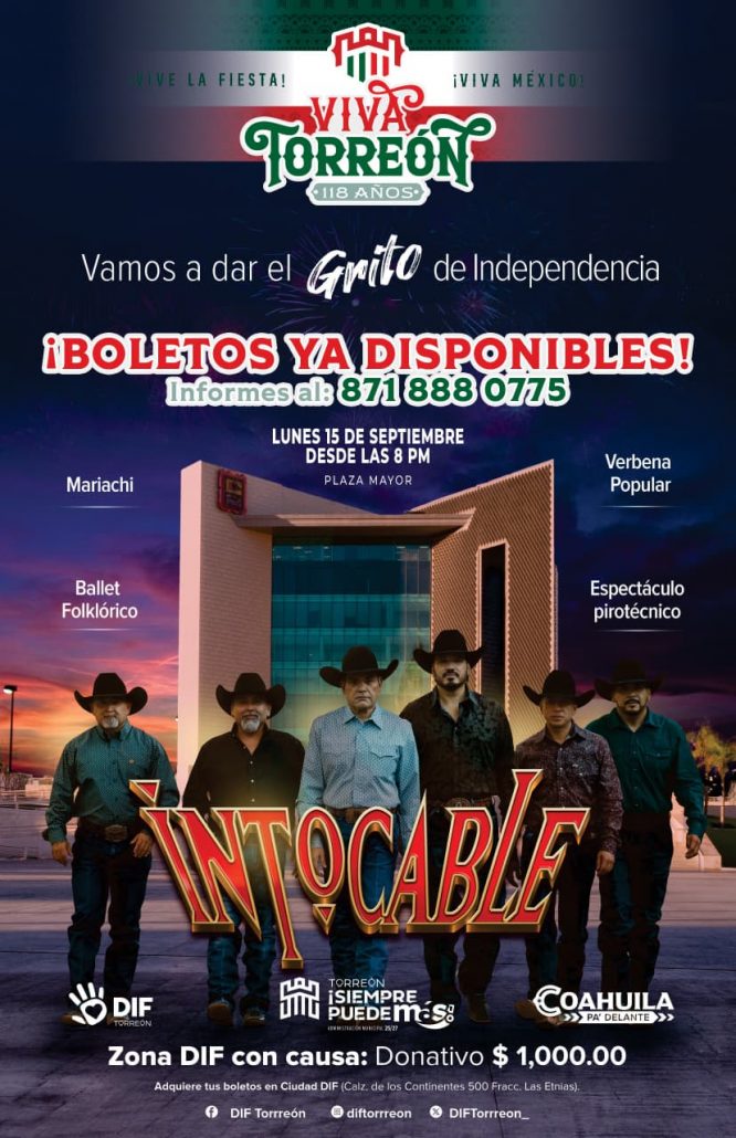 Como parte de la celebración del tradicional Grito de Independencia, el próximo lunes 15 de septiembre los ciudadanos podrán disfrutar de manera gratuita en la Plaza Mayor de Torreón del concierto del grupo Intocable. Sin embargo, están a disposición boletos preferentes para la Zona DIF con Causa.