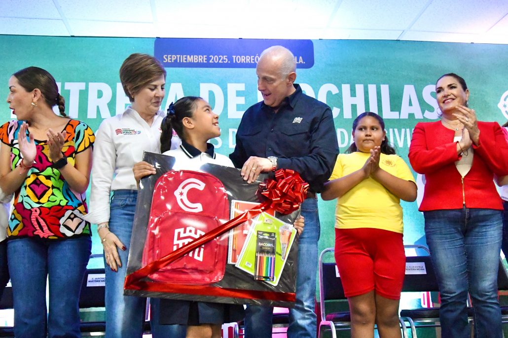 Dijo que gracias a la coordinación con el Gobernador en materia de educación, se fortalecen las estrategias con el programa de entrega de útiles escolares y mochilas en Torreón.