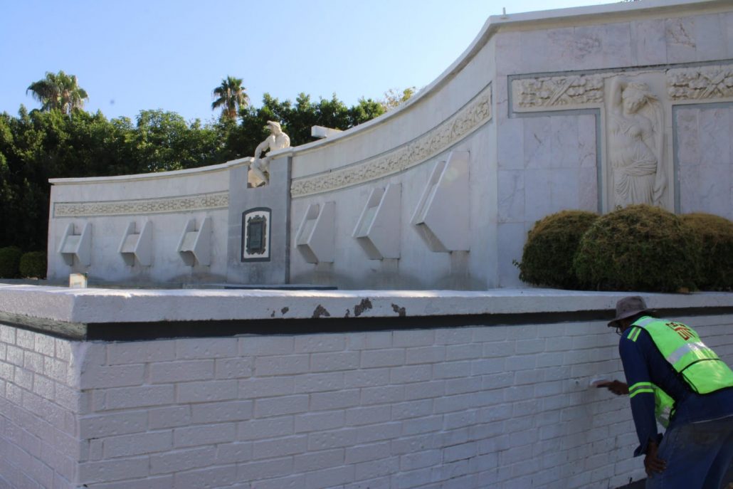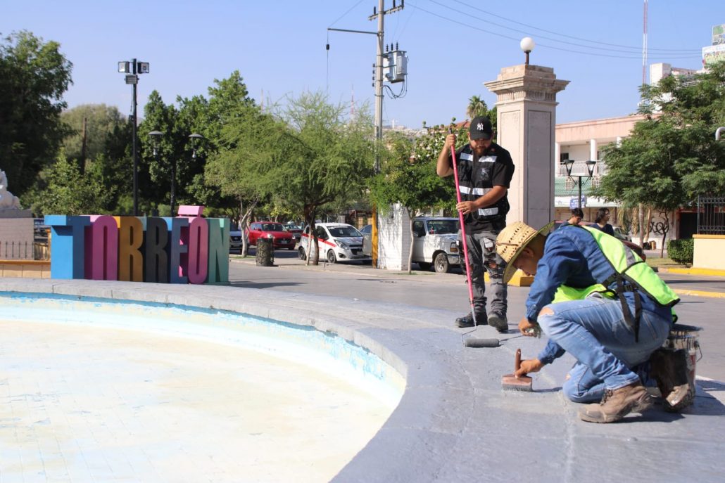 Como parte de las labores para el embellecimiento de Torreón, y la conservación de los monumentos históricos de la ciudad, personal de la Dirección General de Servicios Públicos mantiene labores de restauración de la emblemática “Fuente del Pensador”, ubicada en la Alameda Zaragoza.