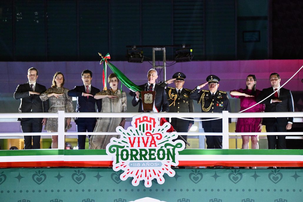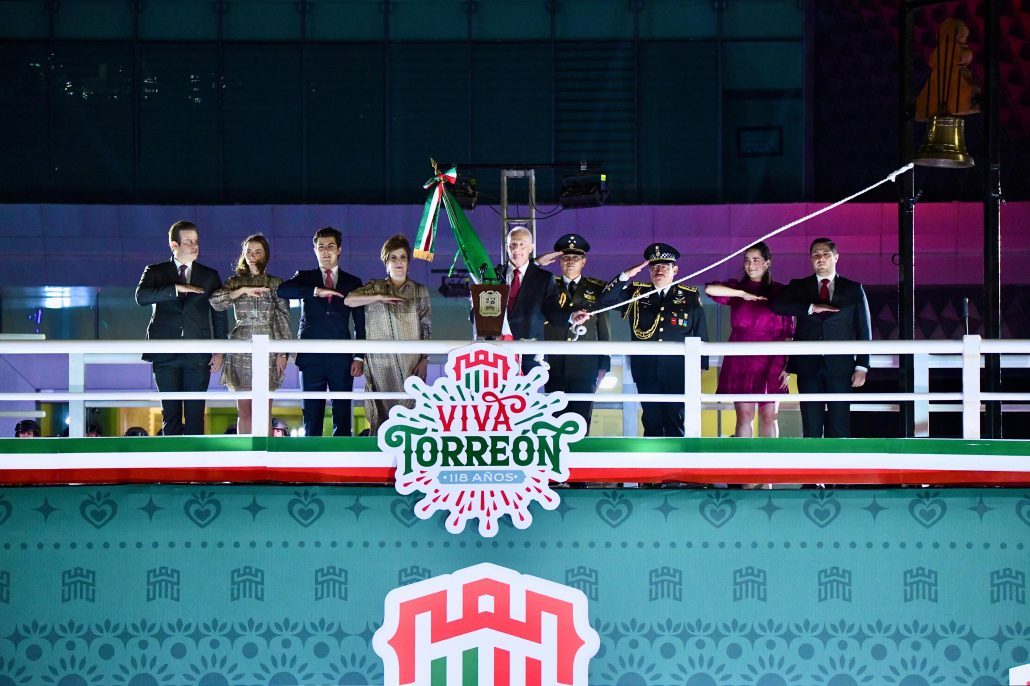 El alcalde Román Alberto Cepeda González presidió la ceremonia de los 215 años del Grito de la Independencia de México, desde el balcón de la Plaza Mayor, evento que también enmarca el 118 aniversario de Torreón como ciudad.