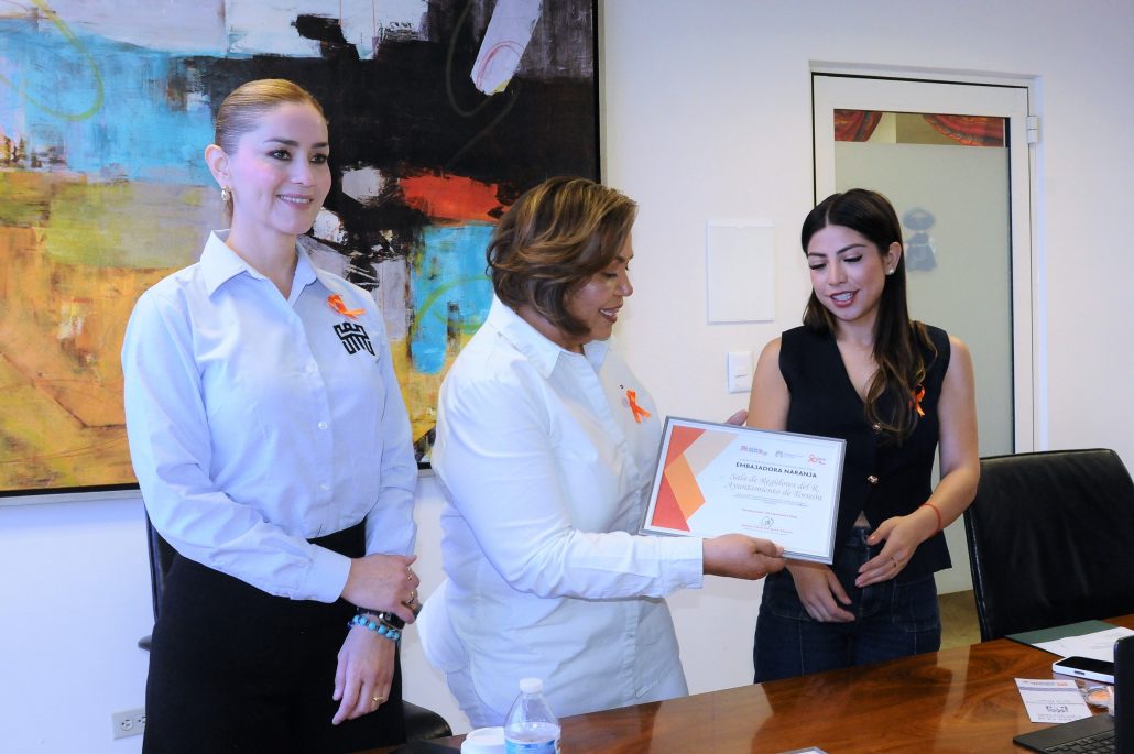En el marco de esta sesión, se hizo entrega de un reconocimiento como Embajadora Naranja a la Sala de Regidores del Ayuntamiento de Torreón, en reconocimiento a su compromiso activo con la prevención y erradicación de la violencia contra mujeres y niñas.