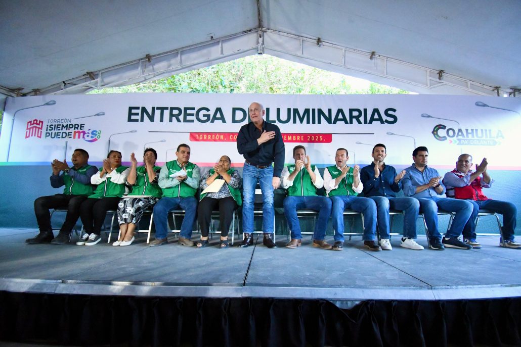 “Torreón no se detiene, ni la coordinación que hay entre el gobernador Manolo Jiménez y un servidor. La iluminación es importante, pero también hace casi dos años pavimentamos todo el acceso al ejido, con una inversión cercana a los 10 millones de pesos. Hoy estamos poniendo los jueguitos y ejercitadores de la plaza, y la modernización del alumbrado, falta una techumbre que habremos de inaugurar antes de diciembre”.