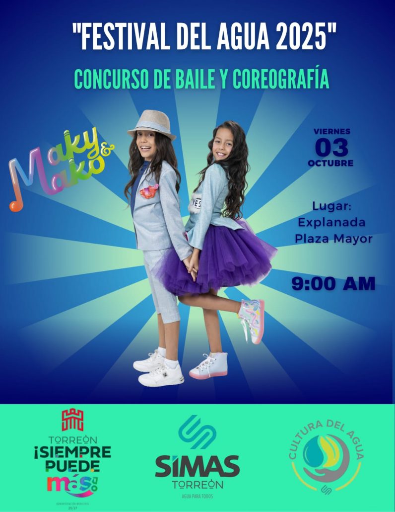 El Sistema Municipal de Aguas y Saneamiento (SIMAS) Torreón informa que el próximo viernes 03 de octubre, se llevará a cabo el «Festival del Agua 2025» en el cual se realizará la presentación de los cantantes «Maky y Mako», así como un concurso de baile y coreografía.