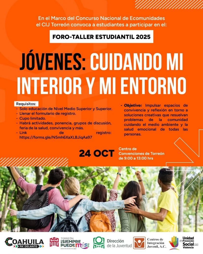 El foro-taller se realizará el viernes 24 de octubre a las 9:00 horas, en el Centro de Convenciones de Torreón, y se llevará a cabo en coordinación con el Centro de Integración Juvenil (CIJ), el DIF Torreón y la Unidad de Prevención Social de la Violencia.
