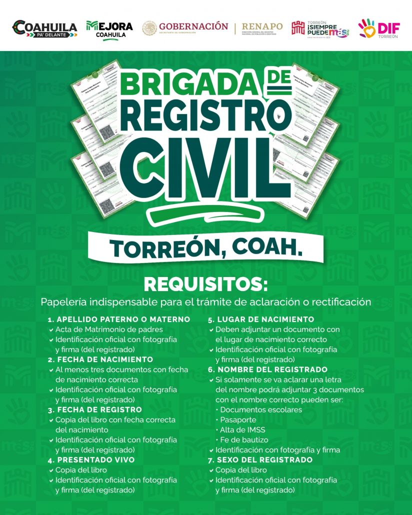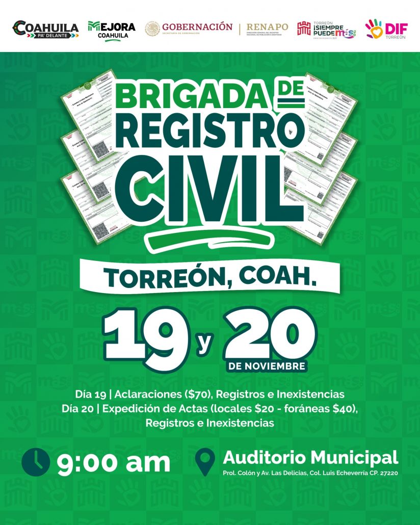 La Administración de Torreón, el Gobierno del Estado y el Registro Nacional de Población, a través del Sistema para el Desarrollo Integral de la Familia (DIF) Torreón, invitan a la ciudadanía a la próxima Brigada de Servicios del Registro Civil que se llevará a cabo los días 19 y 20 de noviembre en el Auditorio Municipal, con el propósito de facilitar a la ciudadanía la realización de trámites esenciales a bajo costo.