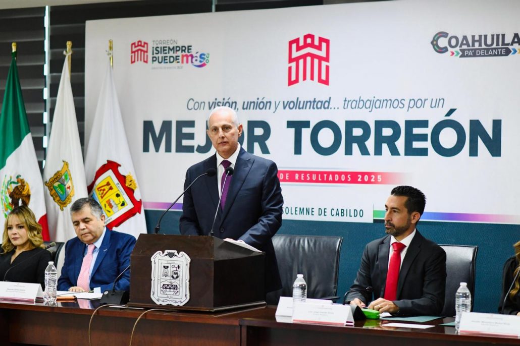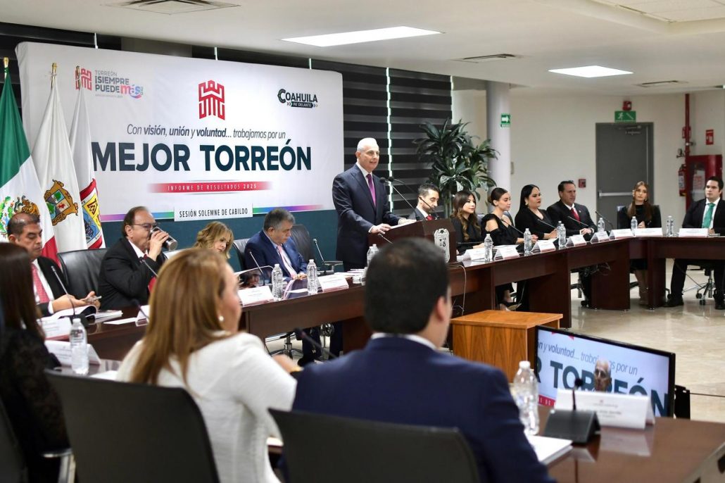 El alcalde Román Alberto Cepeda González entregó durante la Tercera Sesión Solemne de Cabildo, el Primer Informe de Resultados sobre el estado que guarda la actual Administración Pública Municipal, en donde destacó que Torreón está entre las ciudades con más de 500 mil habitantes más seguras del país, así como las acciones en infraestructura, fortalecimiento económico y atención social que se han ejecutado este 2025.