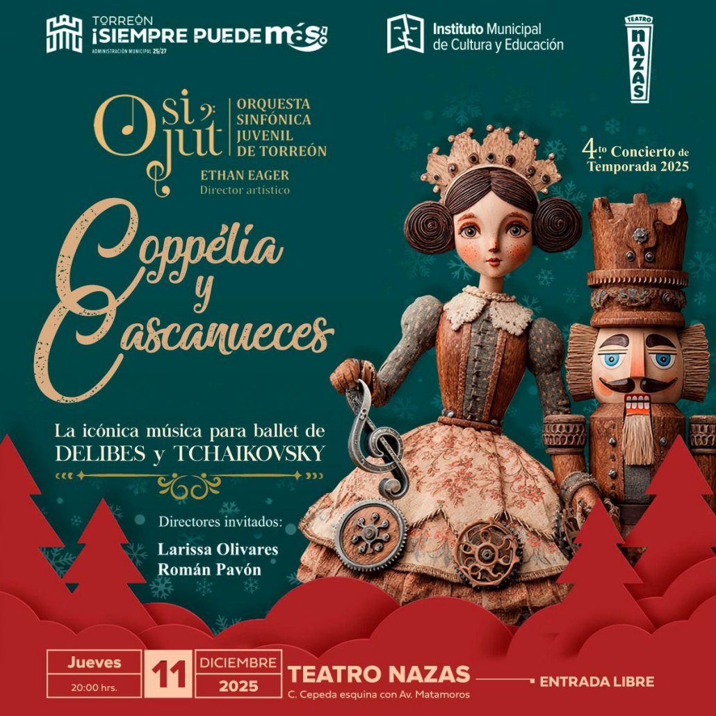 El Ayuntamiento de Torreón, a través del Instituto Municipal de Cultura y Educación (IMCE), invita al cuarto concierto de temporada de la Orquesta Sinfónica Juvenil de Torreón (OSIJUT), el cual contará con un programa dedicado a dos de las partituras más emblemáticas del ballet clásico: Coppélia de Léo Delibes y El Cascanueces de Piotr I. Tchaikovsky.