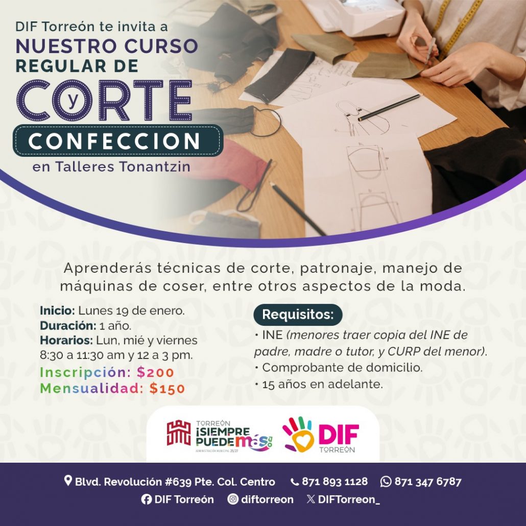 El Sistema para el Desarrollo Integral de la Familia (DIF) Torreón invita a la población a inscribirse en el curso regular de corte y confección, en el cual las y los participantes aprenderán técnicas de corte, patronaje, manejo de máquinas de coser y otros conocimientos básicos relacionados con el diseño y la moda, que les permitirán desarrollar habilidades productivas.